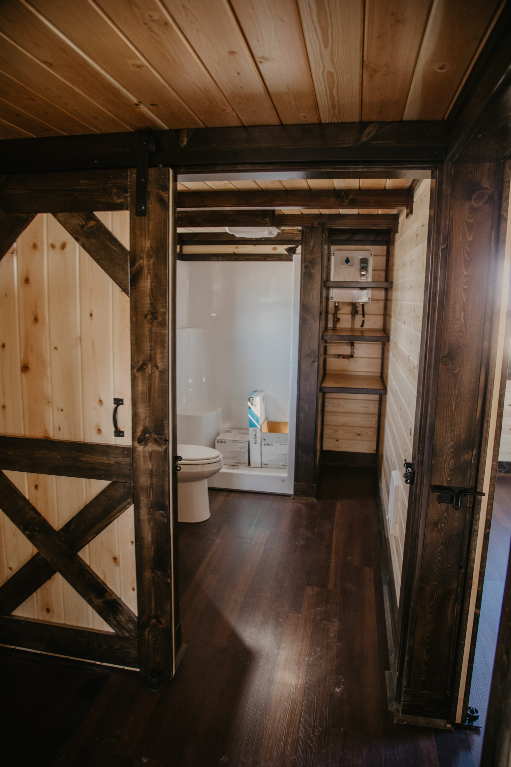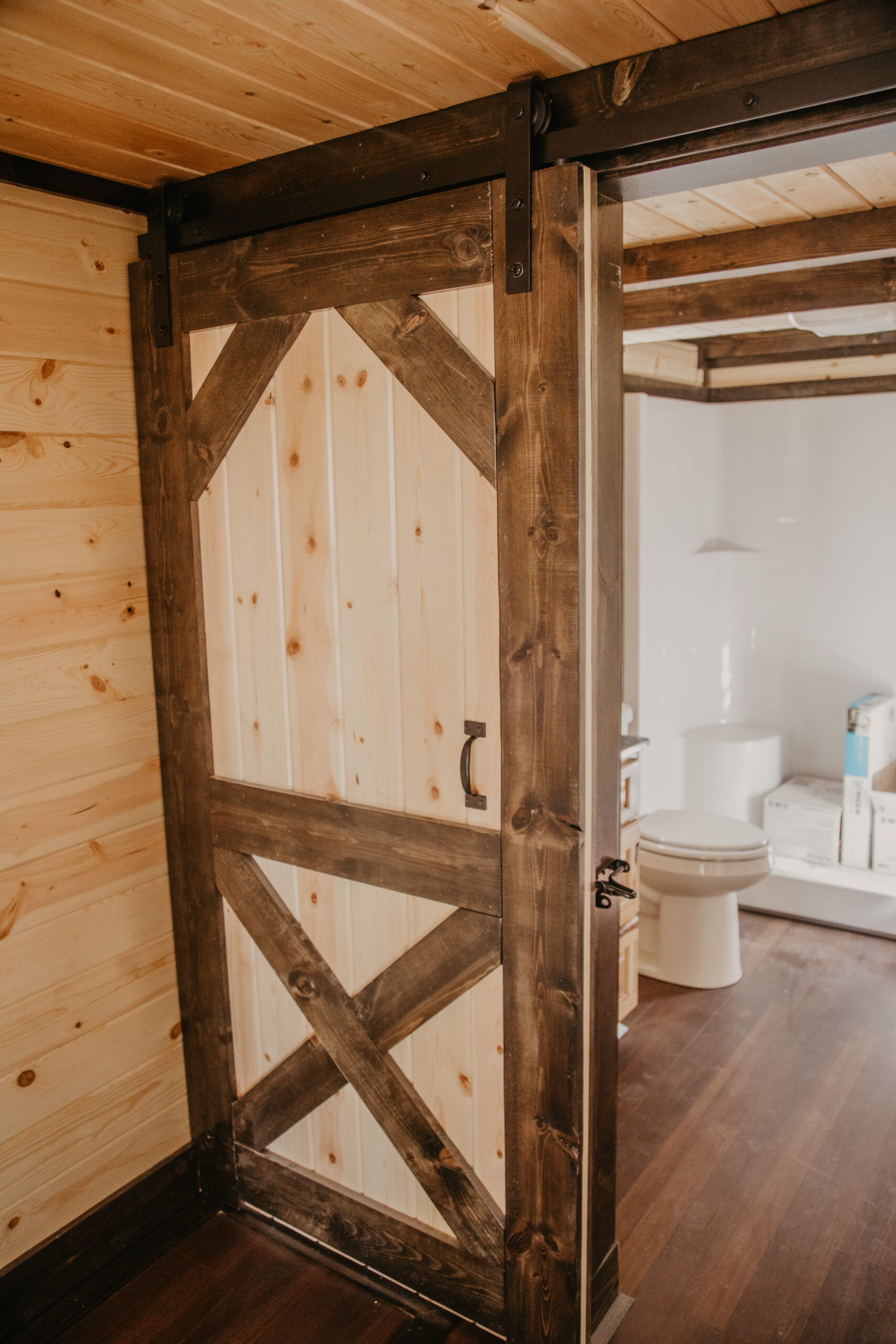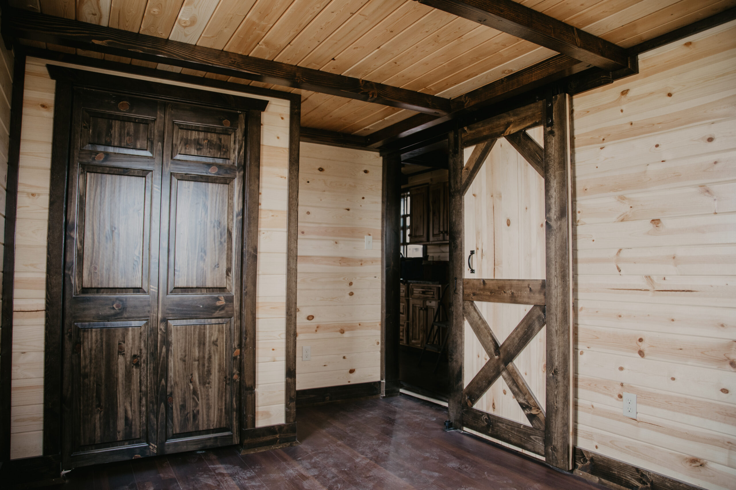 - Character Details: Single barn doors in Jacobean stain replaced standard doors for the bedroom and bathroom, adding architectural interest while maximizing floor space. Additional Jacobean-stained accents tie the aesthetic together. These custom touches remain affordable because they’re integrated during construction rather than added afterward.